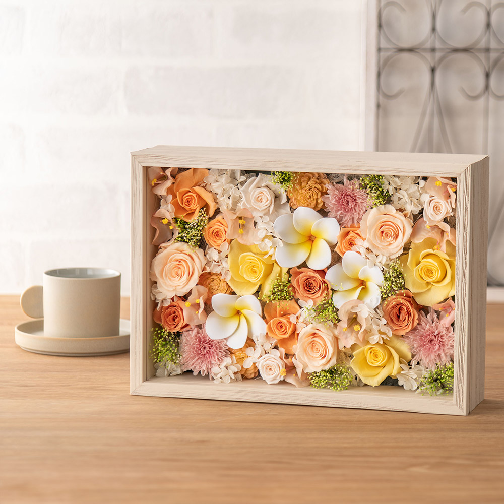 日比谷花壇シニアデザイナー西澤真実子が贈るフラワーフレームアート。可憐なプルメリアの花に黄色やオレンジ色のプリザーブドフラワーを合わせ、夏の眩しい日差しを思い出させるような華やかなフレームアートです。シンプルなデザインのフレームはインテリアとも馴染みやすく、様々なご用途にお使いいただけます。