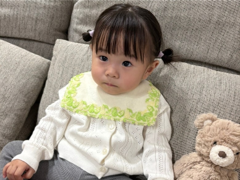 箱から出してそのまま飾れる、華やかな生花(スプレーバラ、カーネーション、スターチス)のブーケ。水やりなどの手間がかからず、忙しいママとパパにも喜ばれる優しいブーケです。そして、繊細なデザインが人気の近沢レース店から、愛らしい洋梨のモチーフの「ベビースタイ」を添えました。人気のシーズンタオルハンカチのレースを使用した、「ベビースタイ」タオル地は、タオルハンカチ同様に今治製です。縫製も日本で丁寧に仕上げています。タオルハンカチと同じくベビースタイも洗濯機でお洗濯可能(ネット使用)。洗濯後のほつれも心配はありません。女の子も、男の子も、みんなの喜ぶ顔が浮かんできそうな、幸せスタイをお届けします。