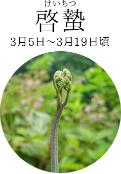 - 冬ごもりをしていた虫が暖かな土を感じ、姿を現わすころ。一雨ごとに気温が上がり、日差しもどんどん暖かくなると、わらびやぜんまいなどの山菜が顔を出します。おひたしや和え物にして、食卓にも春の訪れを。